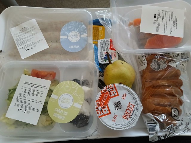В день выписки покормили отличным завтраком: овощной салат с брынзой и маслинами, блинчики, сёмга, булочка с джемом, йогурт, сливочное масло, плавленый сырок, джем, груша, чай. Для меня даже слишком много.